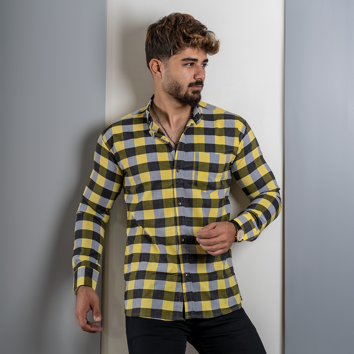 پیراهن چهارخانه زرد مردانه مدل unam
